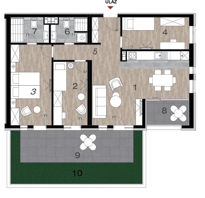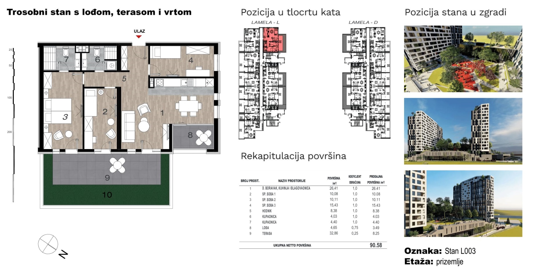 Prodaje se trosoban stan sa velikom terasom i privatnim vrtom površine 90,58 kvadrata u stambeno poslovnom objektu u izgradnji “C2” u lameli “L”. Nalazi se u prizemlju objekta a sadrži hodnik, dnevni boravak sa trpezarijom i kuhinjom, tri spavaće sobe, dvije kupaonice, lođu i veliku otvorenu terasu površine 32,86 kvadrata (8,25 m2 od ukupne površine) sa zelenom površinom.